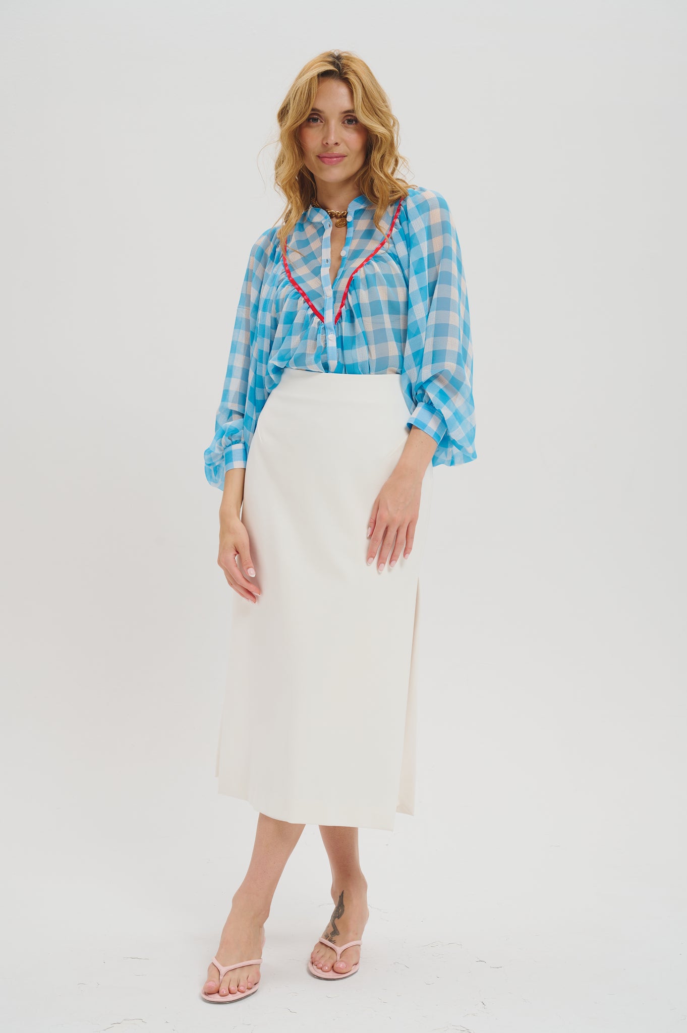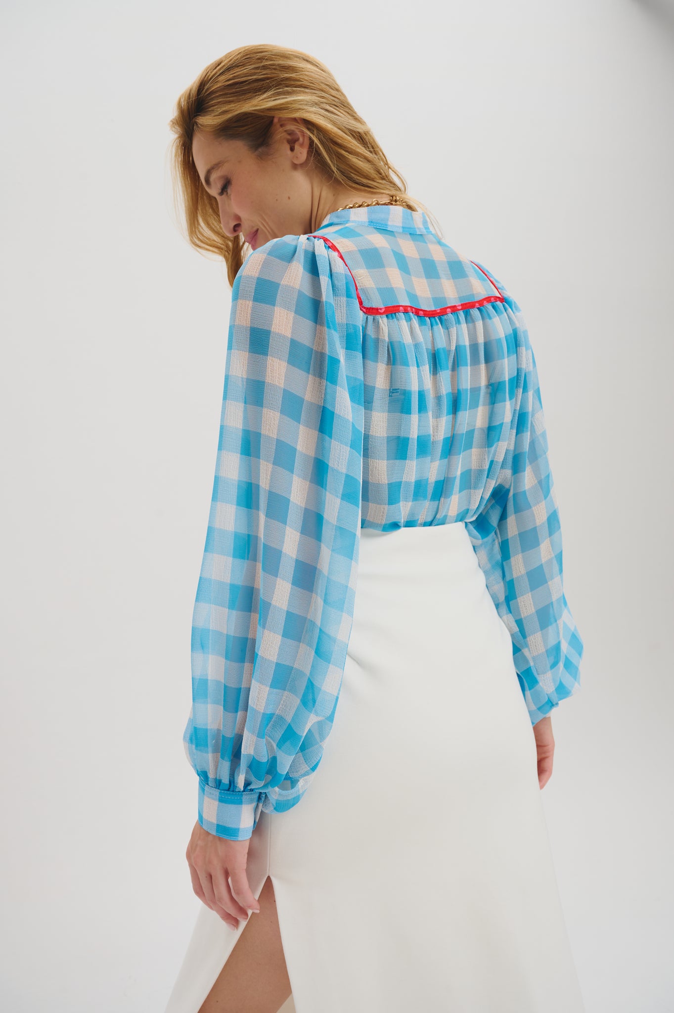 The Edith blouse features a fluid, lightweight blue and white plaid chiffon fabric and an ample circular cut for a flowing silhouette. Long balloon sleeves add soft volume, while delicate gathers enhance its airy drape. The deep V-yoke is finished with a contrasting red trim, bringing a refined yet distinctive accent to the design. A true statement piece that balances femininity and ease, ideal for both everyday wear and elevated occasions.