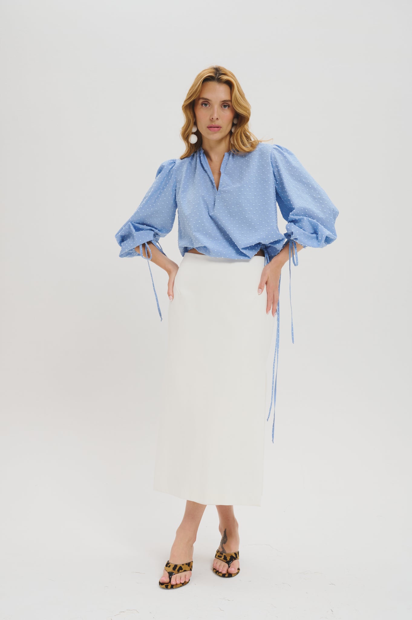 Crafted in a soft blue hue, this blouse is defined by its softly structured silhouette and dramatic balloon sleeves. The relaxed body drapes effortlessly, while delicate adjustable ties at the waist and cuffs add dimension and subtle femininity.